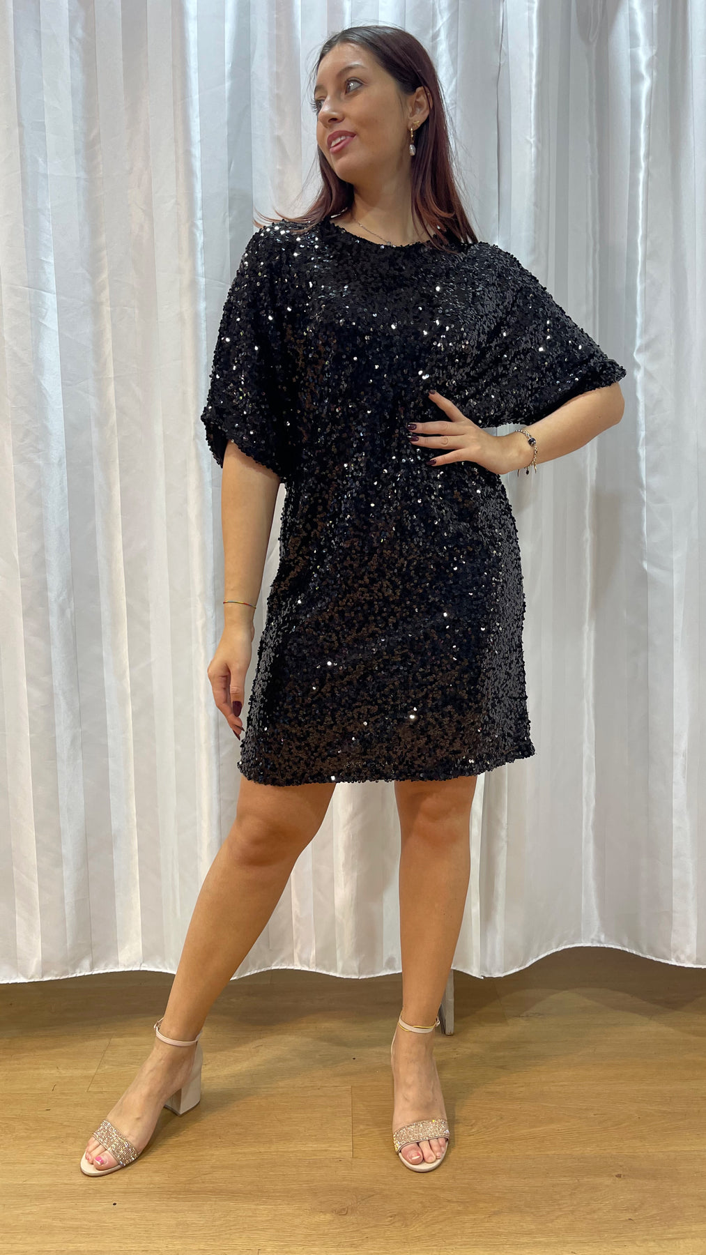 ✨ Abito corto interamente ricoperto di paillettes, con taglio morbido e maniche ad aletta. La linea dritta valorizza ogni silhouette, garantendo comfort e libertà di movimento. Ideale per serate eleganti, feste o eventi speciali.