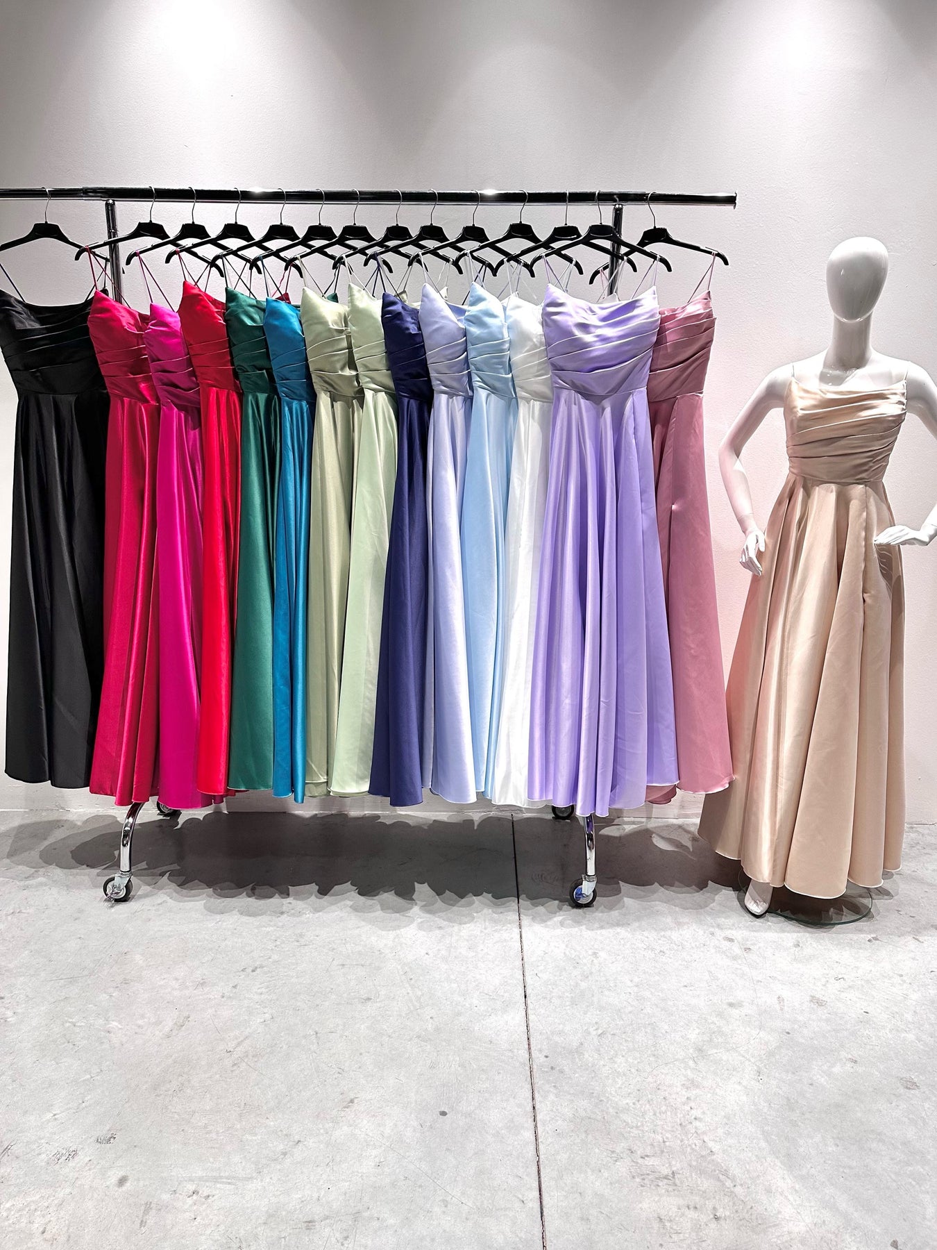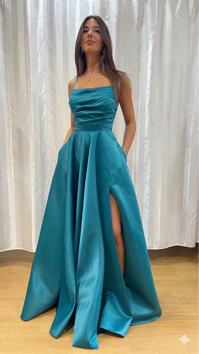 La gonna è ampia e fluida, con una splendida apertura laterale che dona movimento e slancia la figura, creando un effetto scenografico ad ogni passo. Il tessuto leggermente luminoso rende l’abito particolarmente raffinato e ideale per eventi eleganti.