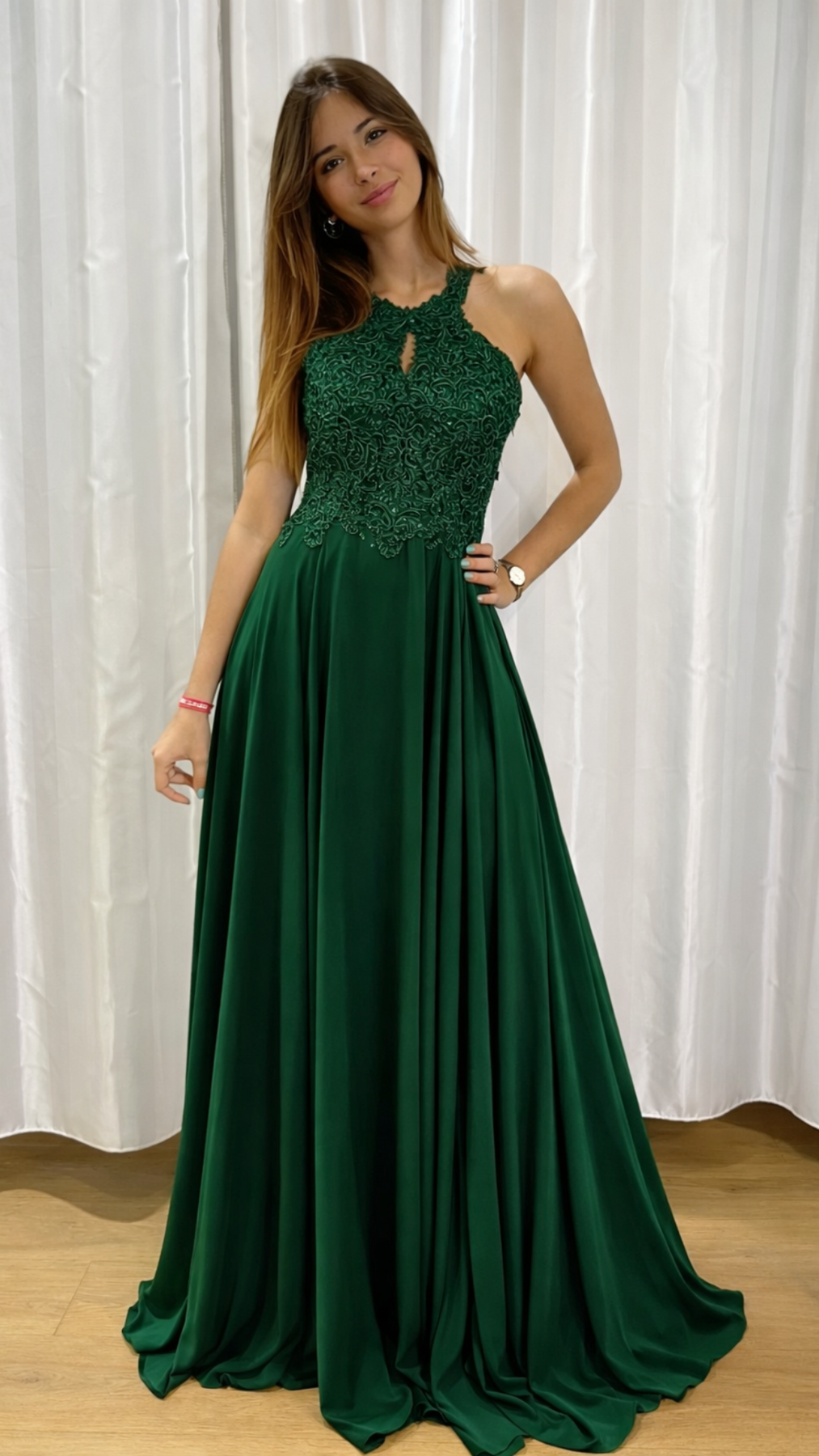 Raffinato abito da cerimonia con corpetto ricamato in pizzo e scollatura all’americana, impreziosito da dettagli floreali che valorizzano il décolleté. Le coppe imbottite offrono un sostegno confortevole e una vestibilità perfetta, senza bisogno di reggiseno.