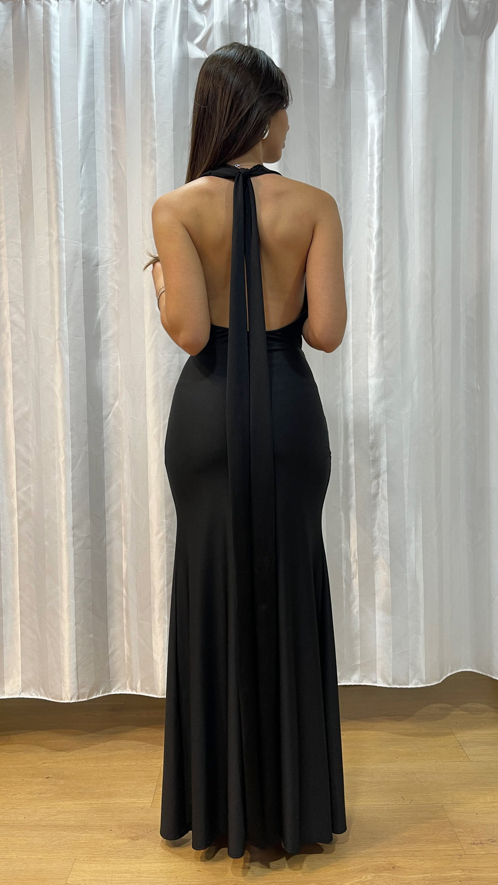 Abito da cerimonia lungo con scollo a V profondo e schiena scoperta, perfetto per valorizzare la silhouette con eleganza e sensualità.