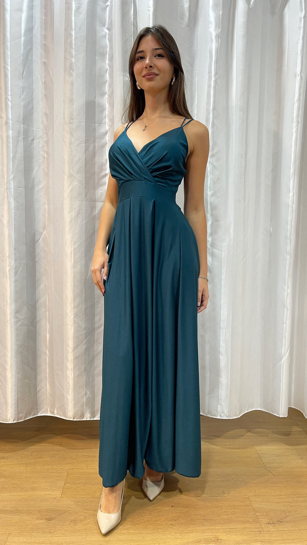 Elegante abito lungo in tessuto fluido molto elasticizzato,con coppe preformate per un sostegno naturale e una vestibilità confortevole. Lo scollo a V incrociato valorizza il décolleté, mentre le spalline sottili e incrociate sul retro donano un tocco raffinato.