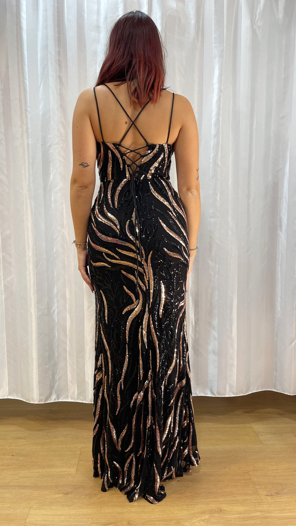 Lo spacco laterale profondo slancia la figura e aggiunge un tocco di audacia, mantenendo sempre uno stile elegante e raffinato. La chiusura posteriore con intreccio regolabile consente di adattare l’abito in modo preciso alla propria forma, garantendo un fit impeccabile e una silhouette valorizzata in ogni dettaglio.