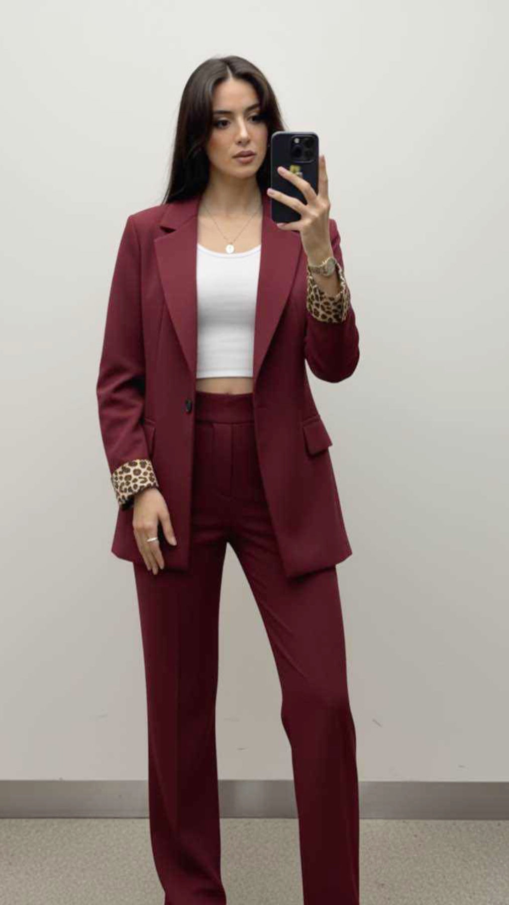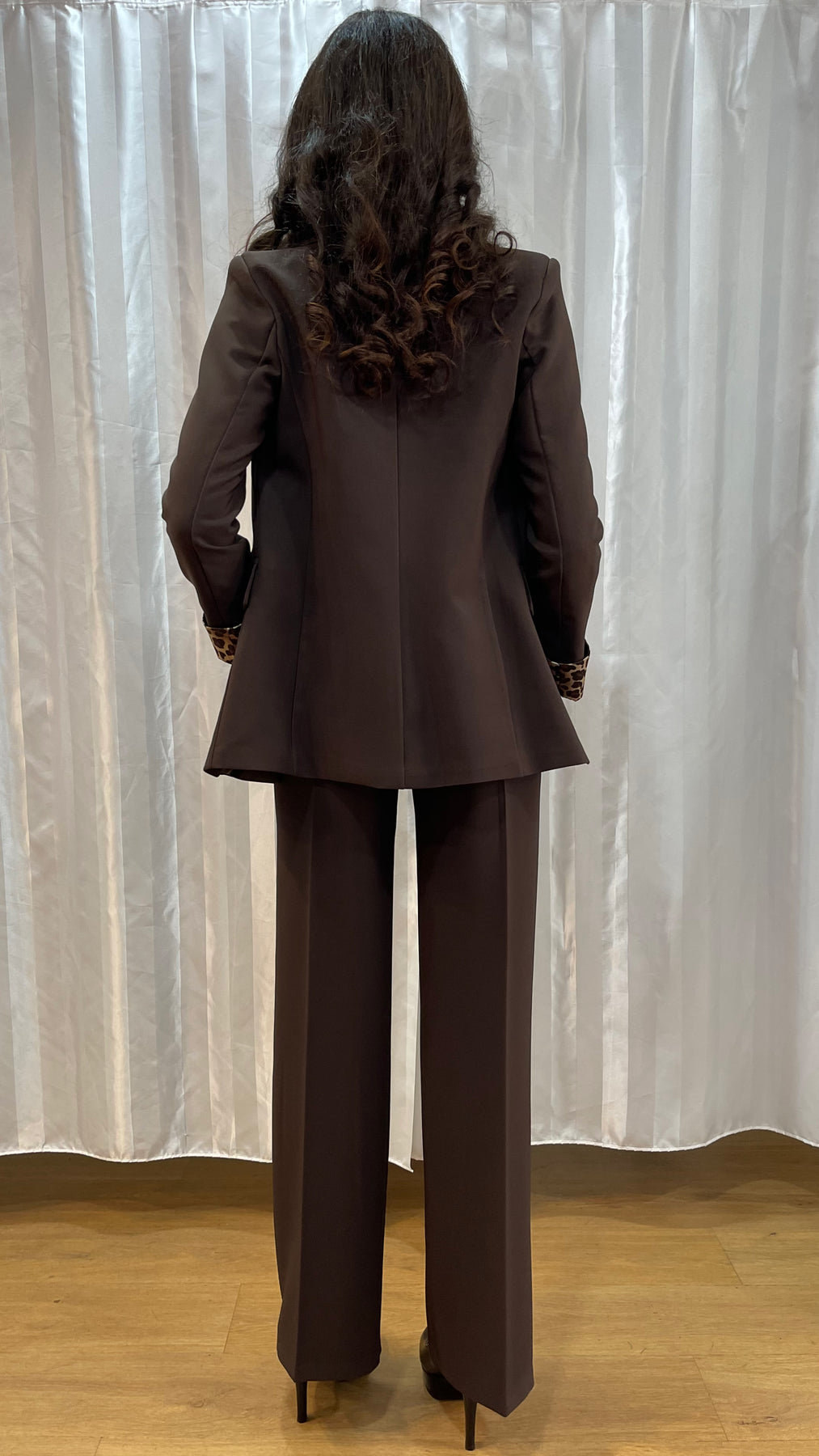 La giacca dal taglio sartoriale presenta una linea dritta e moderna, con revers classici e maniche risvoltate che rivelano l’interno a stampa animalier, un dettaglio di tendenza che dona originalità e grinta al look.