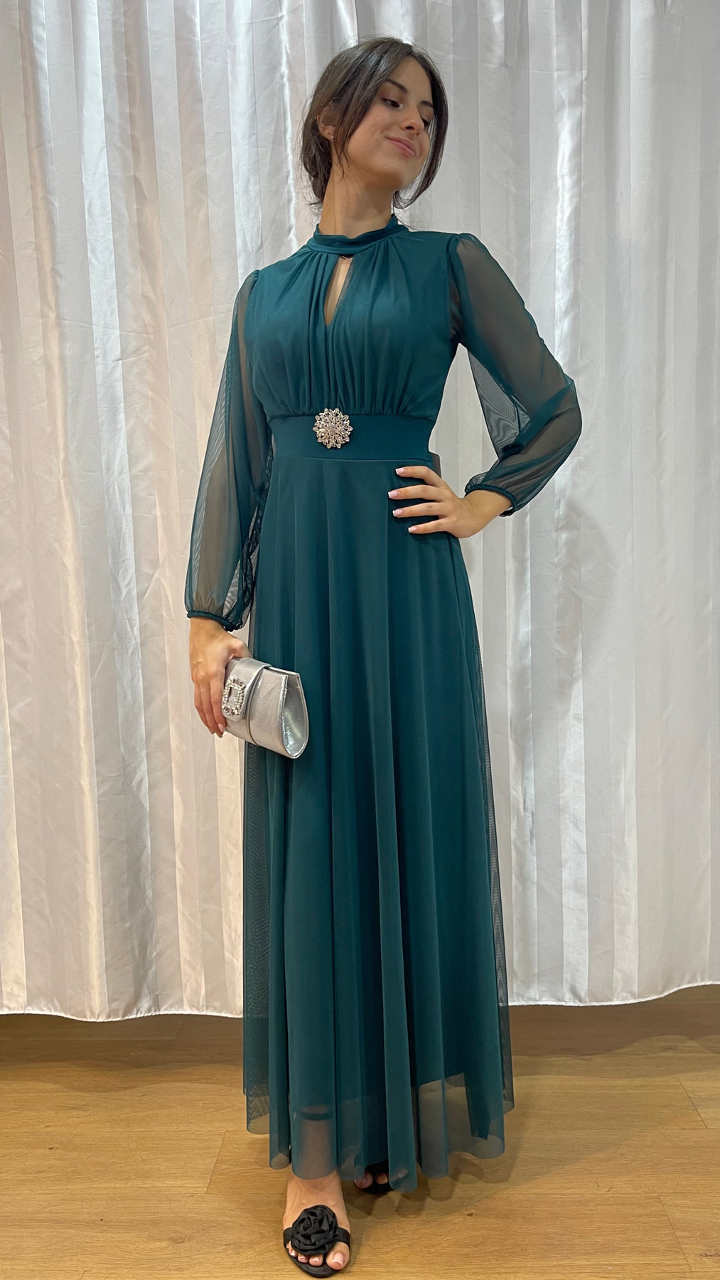 Raffinato ed estremamente femminile, questo abito lungo è la scelta perfetta per cerimonie, matrimoni, feste ed eventi speciali.