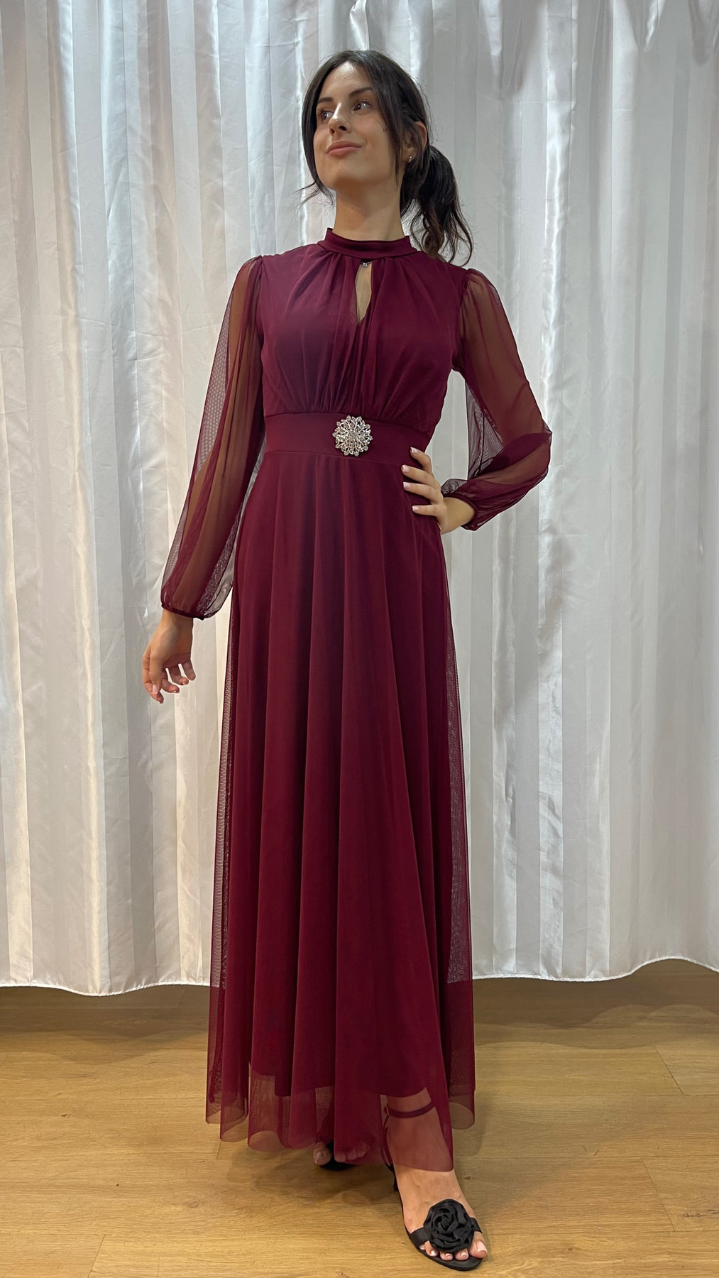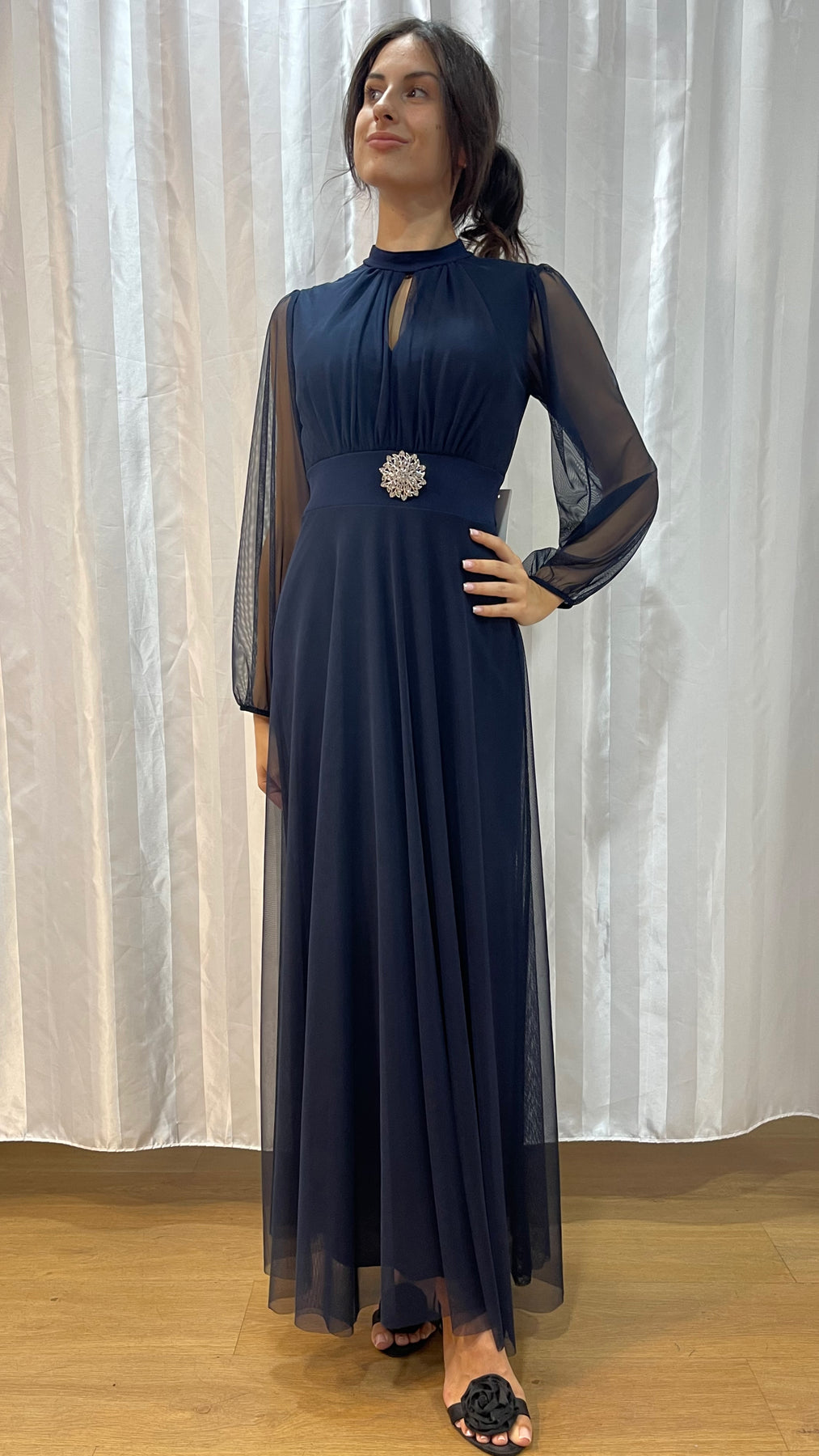 Il modello valorizza la silhouette grazie al punto vita segnato e alla gonna fluida che cade morbida fino a terra.