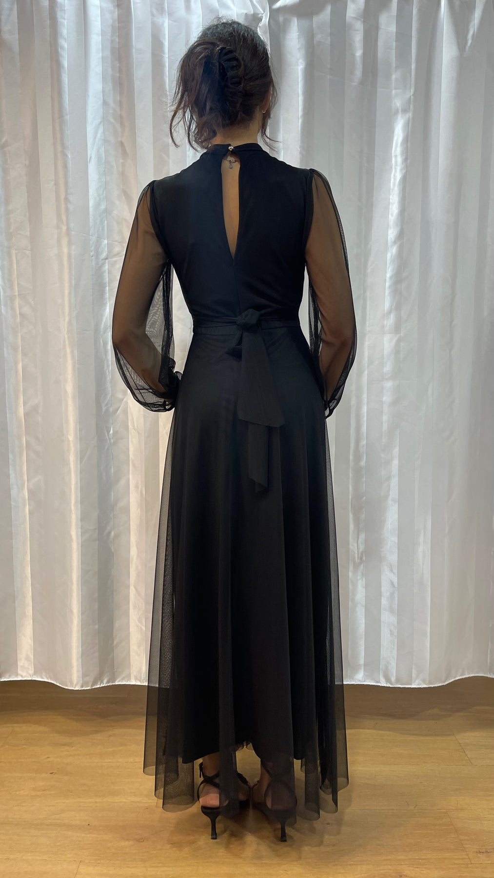 • Maniche lunghe in chiffon trasparente con polsino arricciato