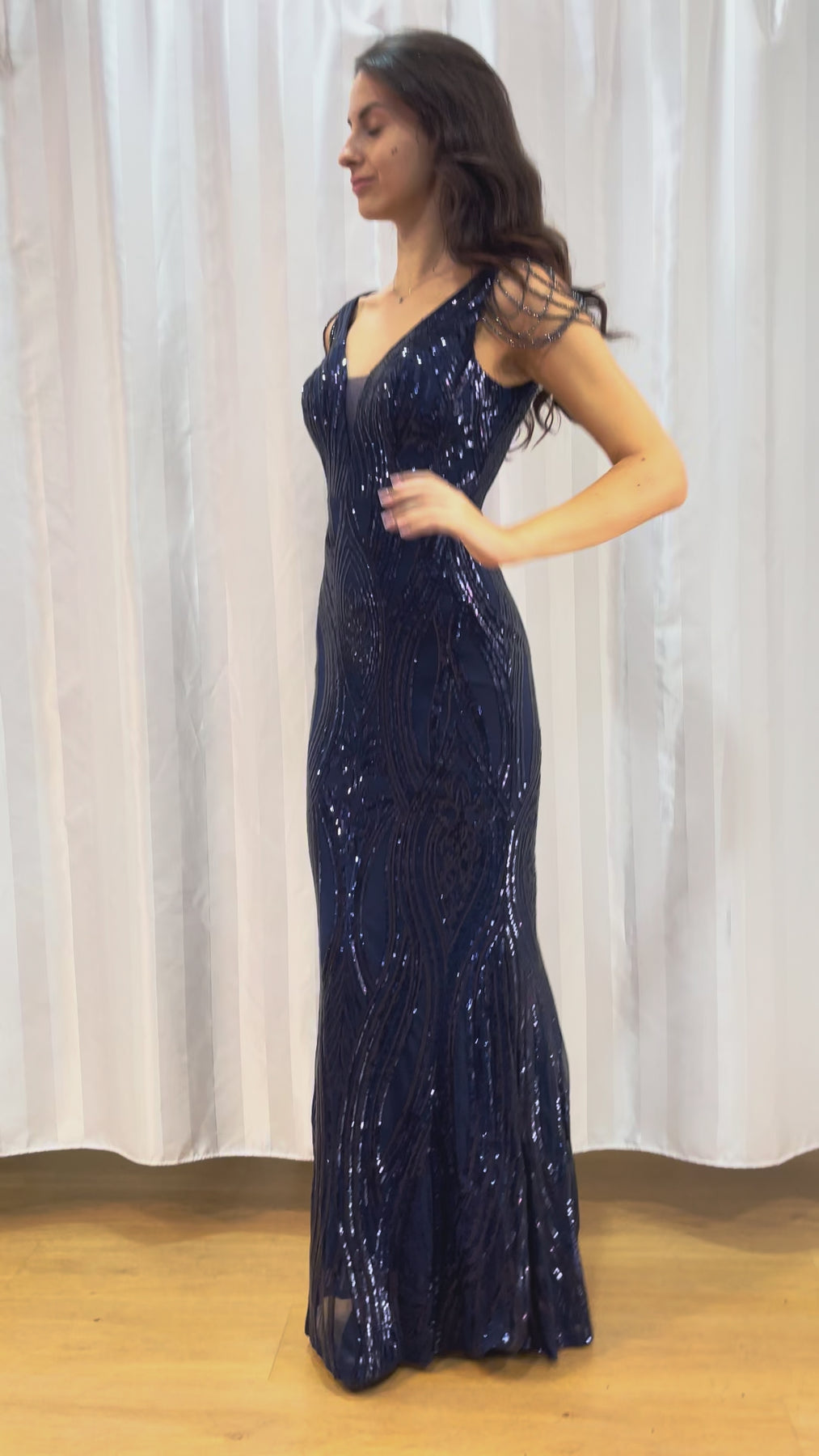 Abito da cerimonia lungo con scollo a V sia sul davanti che sul retro, impreziosito da una lavorazione interamente ricamata con paillettes che creano un elegante motivo luminoso.